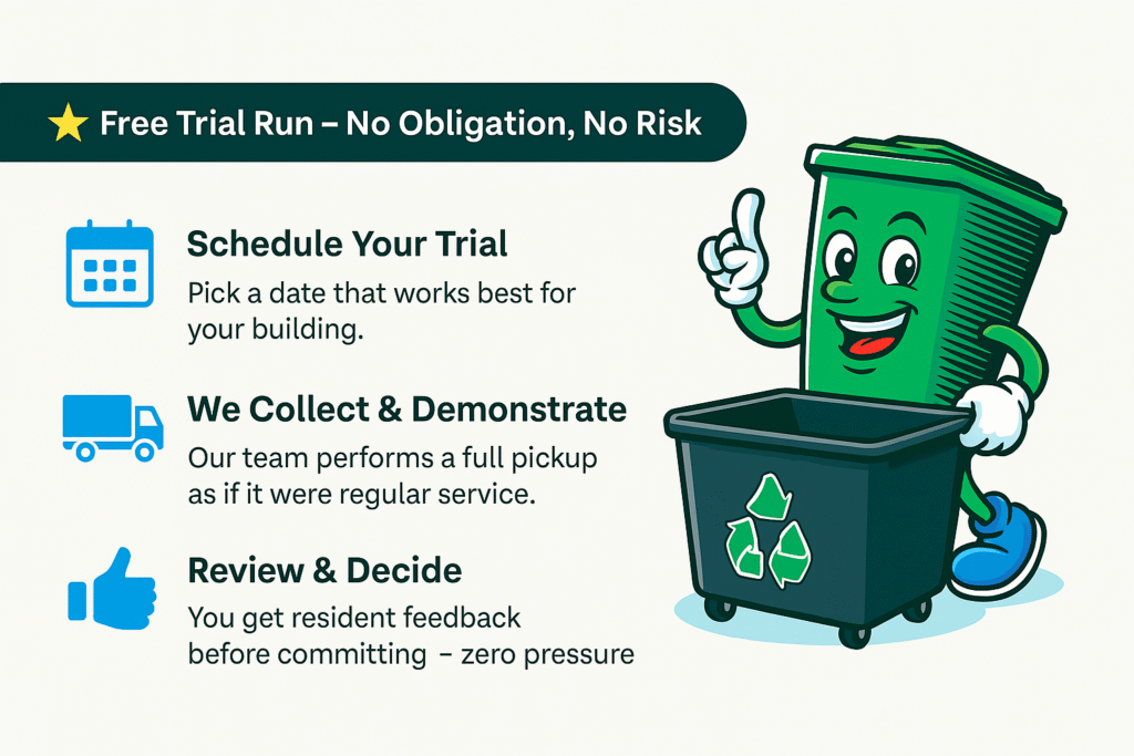 We customize pickup schedules and pricing to match your building’s needs — whether it’s once a week or five times. Affordable, convenient, and designed to keep everyone happy.